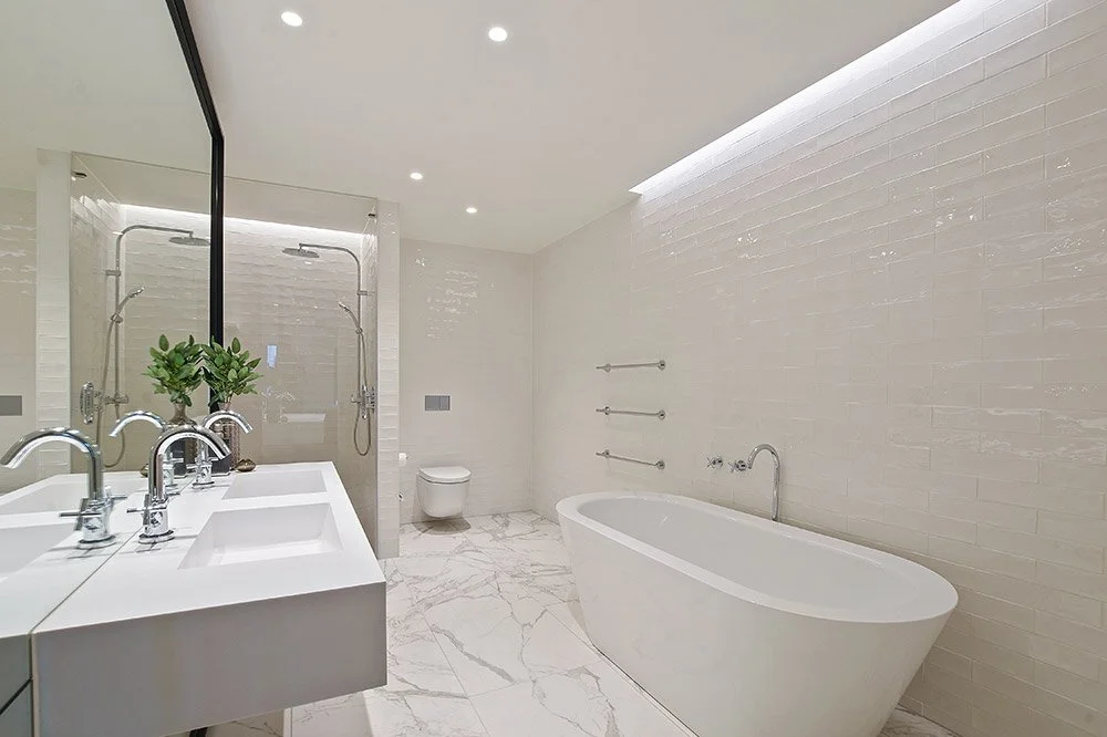 Two beautifully designed double bedrooms feature warm wood finishes and a soothing neutral palette, complemented by two sleek bathrooms, one with a luxurious bathtub for ultimate relaxation.