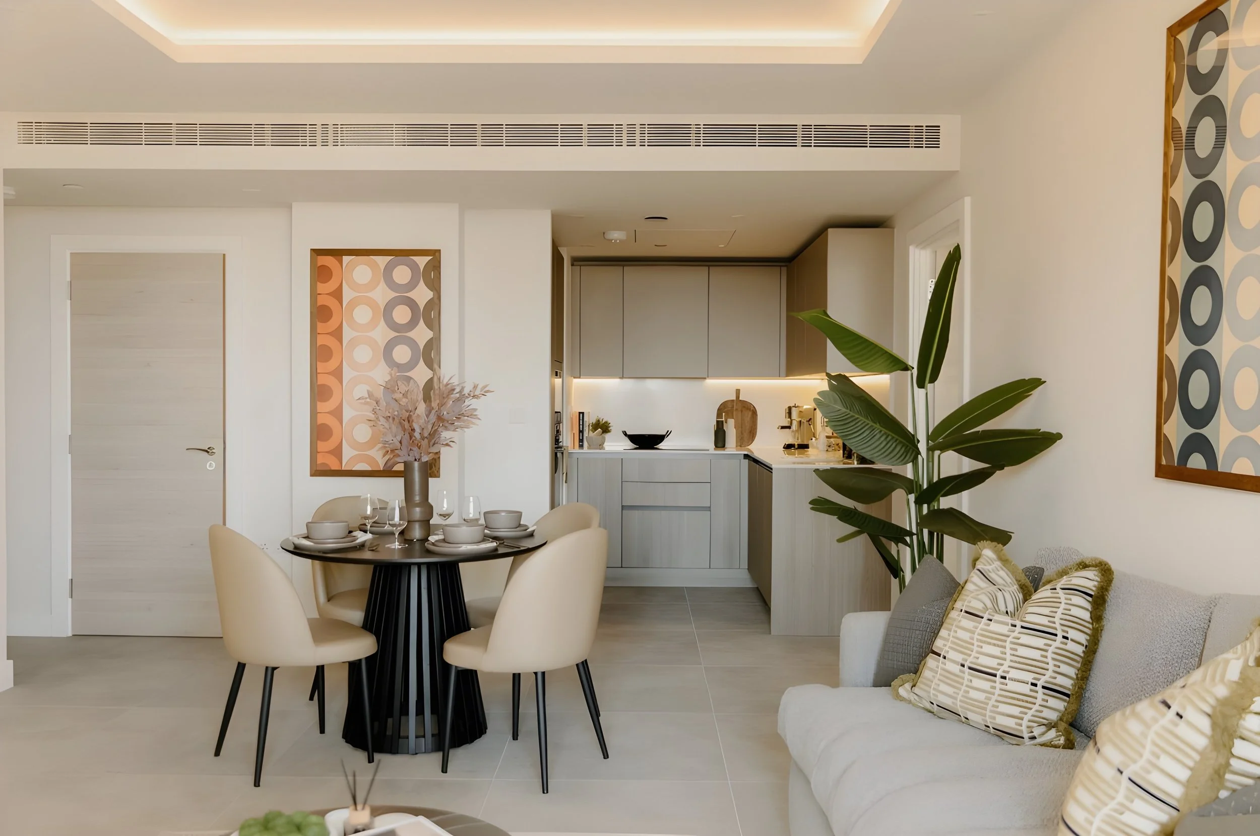 Spanning 68 sqm, the apartment features a bright living area with comfortable seating, Smart TV, and soft, neutral décor. The fully equipped kitchen includes a dishwasher, coffee machine, and washer dryer, while both bedrooms are designed for rest and comfort. With a modern bathroom, weekly housekeeping, and high-speed Wi-Fi, this apartment perfectly balances convenience and relaxation.